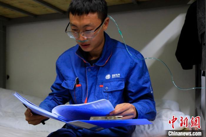 圖為付新程完成當日的檢修工作,在宿舍內一邊吸氧氣,一邊研究工作方案。孟瑋 攝
