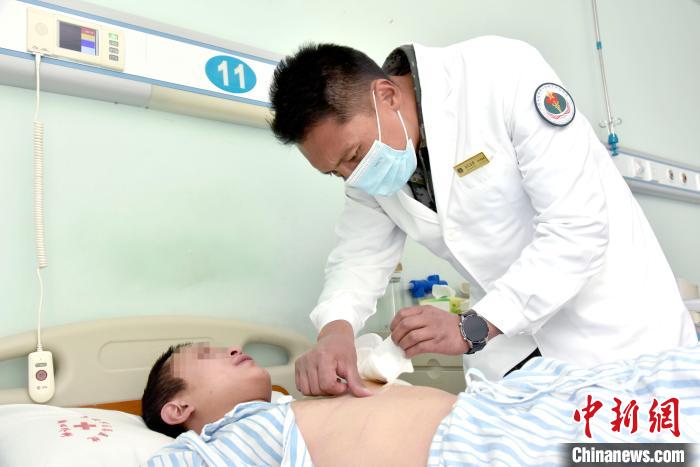 圖為西藏軍區總醫院胸科主任副主任醫師次仁云丹檢查患者小孔傷口恢復情況。李林 攝