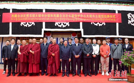 5月26日,西藏自治區圖書館大昭寺分館和自治區古籍保護中心大昭寺古籍館正式揭牌。這是繼拉薩哲蚌寺之后,又一座寺廟建立分館。圖為揭牌儀式現場。 中新社記者 貢嘎來松 攝