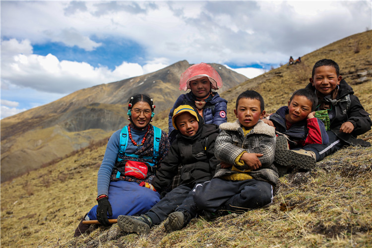 牧民其美嘎德(左一)在蟲草采挖間隙和當地一些孩子在一起(5月25日攝)。新華社記者 姜帆 攝
