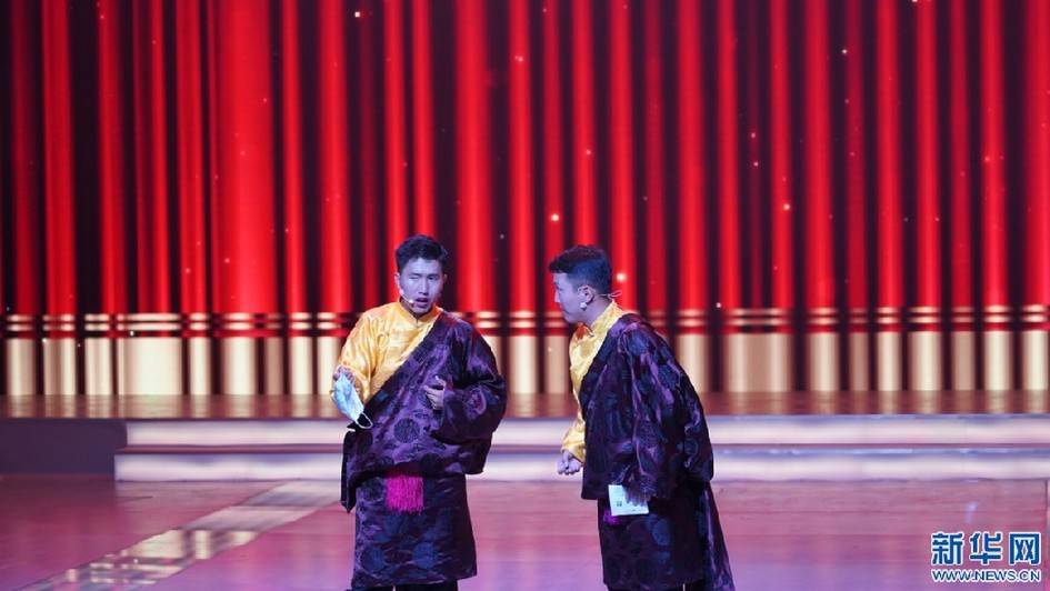 圖為晚會現(xiàn)場相聲表演《防疫從我做起》(5月31日攝)。新華網(wǎng)發(fā) 貢桑央吉(實習(xí)生)攝