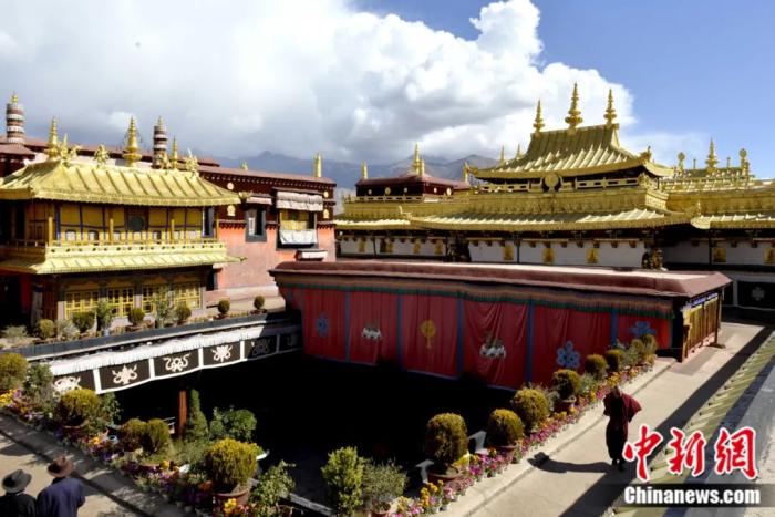 2014年10月拍攝的大昭寺金頂。大昭寺是西藏重大佛事活動的中心,“噶廈”政府的機構設于寺內。許多重大的政治、宗教活動,如“金瓶掣簽”等都在這里進行。中新社記者 李林 攝