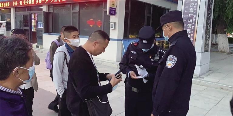 民警使用5G移動警務終端對過往人員進行檢查。圖由布達拉宮便民警務站提供