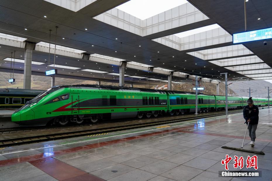 6月25日,西藏第一條電氣化鐵路——拉林鐵路開通運營滿一周年。一年來,累計運送旅客113.7萬人次、貨物4.78萬噸。圖為當日,拉薩火車站內,復興號整裝待發。 中新社記者 江飛波 攝