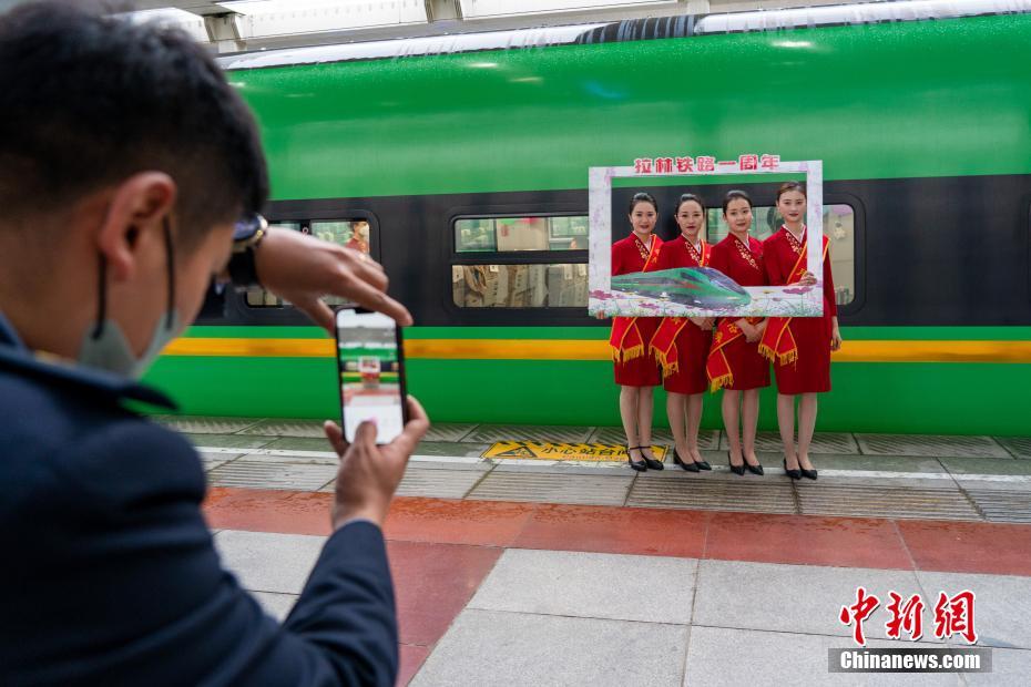 圖為當日清晨,拉薩火車站,C881次列車出發前,“動姐”們在高原復興號前合影留念,紀念拉林鐵路通車一周年。 中新社記者 江飛波 攝