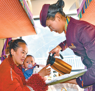 青藏鐵路延長(zhǎng)線拉日鐵路Z8801次列車(chē)上,乘務(wù)員在為乘客倒水。新華社記者 張汝鋒攝