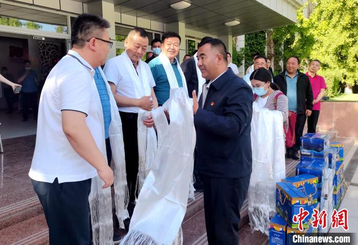 圖為日土縣縣長達瓦次仁為考察團一行獻哈達。日土縣縣委供圖