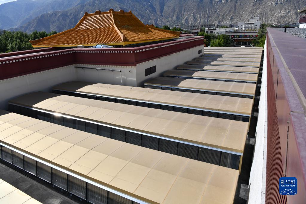 中建一局工作人員檢查高散輻射主動式太陽能供暖設備(7月6日攝)。新華社記者 晉美多吉 攝