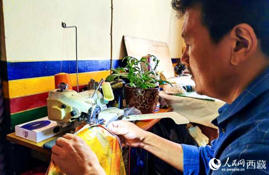 米瑪格列正在縫制藏裝。人民網 李海霞攝