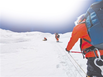 但還是碰上了意外。從8300米再往上走,積雪有五六十厘米深,沿路安全繩都被雪埋了。安全繩是登頂的生命繩,大家必須把繩子拽出來,抖掉冰,再一點點前進。到達海拔8800米處,比原計劃晚了三個小時。