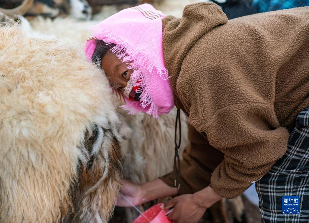 傍晚,男人們放牧歸來,羊群被趕到圍欄邊,嘎瑪的外孫女石秀措姆加入了擠奶的隊伍。