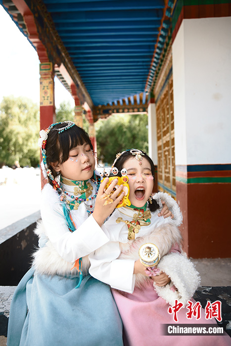圖為7月13日,兩位小游客在拉薩體驗藏族服飾寫真。 中新社發 郭琳 攝