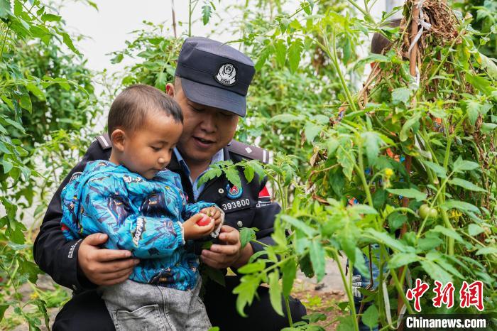 圖為亞東出入境邊防檢查站民警與龐達村雙語幼兒園小朋友共同采摘成熟了的西紅柿。李錦輝 攝