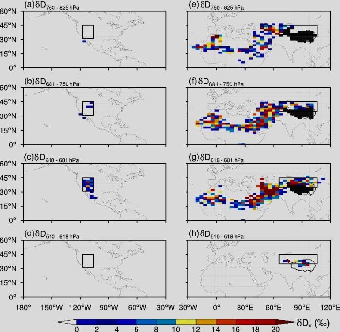 夏季美國西部和亞洲干旱區不同層水汽穩定同位素的“反高程效應”的空間分布格局。 中科院青藏高原所 供圖