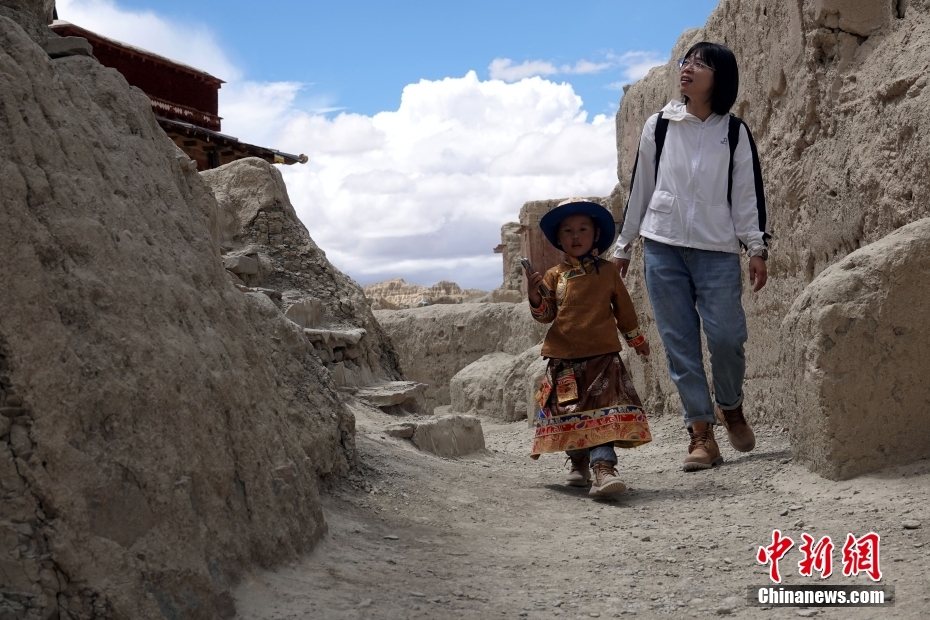 8月4日,西藏自治區阿里地區札達縣,執行2022年夏季科考任務的中國第二次青藏高原綜合科學考察研究(青藏科考)“人類活動歷史及其影響”分隊,在古格王朝(966年-1630年)都城遺址實地考察調研。據了解,古格王朝都城遺址總面積達75萬平方米,海拔約3900米,現有窯洞、碉堡、白塔等各類建筑遺跡共1416處,整個建筑規模宏大,布局嚴謹,氣勢宏偉,1961年被列為國家級首批重點文物保護單位。圖為一對母子游客在遺址頂端參觀。 中新社記者 孫自法 攝