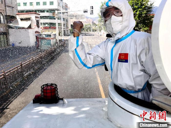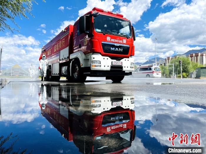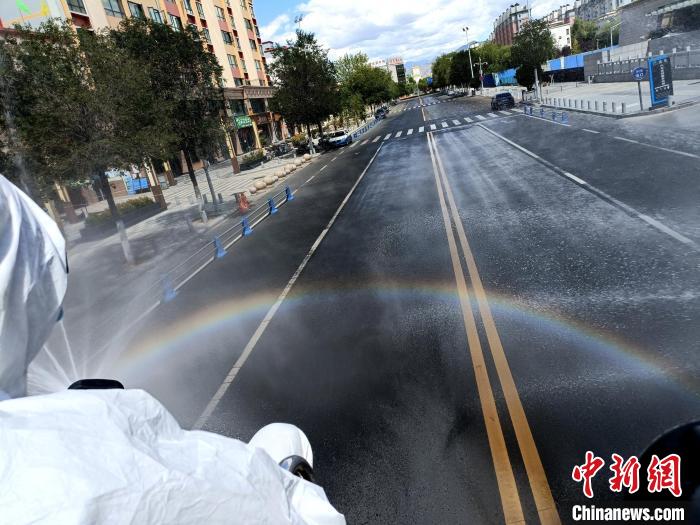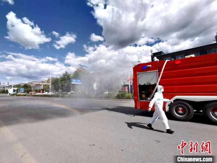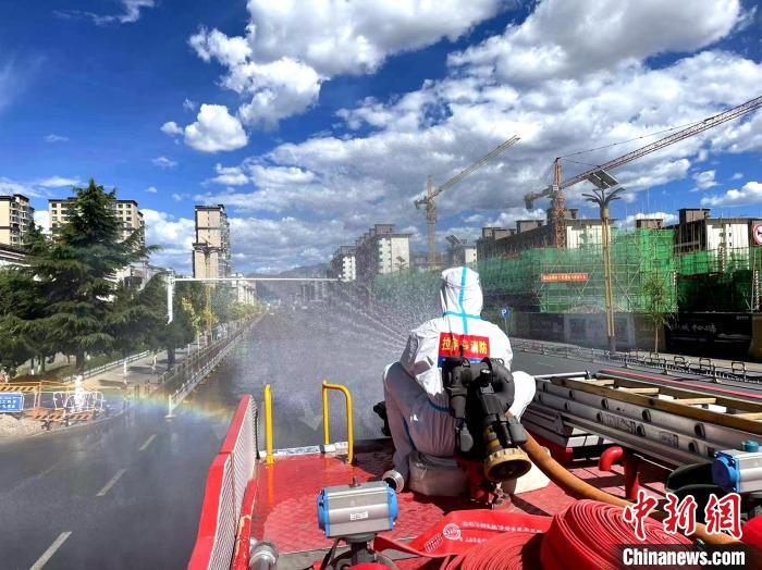 圖為拉薩消防指戰(zhàn)員在主城區(qū)街道進(jìn)行消殺。 拉薩市消防救援支隊(duì) 攝