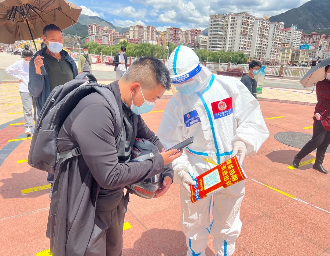 “為了您的安全,請保持1米以上間隔,謝謝?!蓖砩?點多,在茶馬廣場,支隊三級消防士張興梁,依然堅守在抗疫一線,維持著排隊做核酸的長隊。從早上7點開始,張興梁和其他消防隊員已堅守了14個多小時。“西藏晝夜溫差特大,白天防護服里面衣服都濕透了,但是到晚上這個點已經干了,正好不用換衣服了。”張興梁打趣的說到。