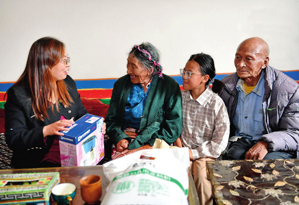 王玉秀(左一)來到拉薩市達孜區德慶鎮次旦老人家走訪并送上慰問品(2022 年 7月 27 日攝) 張汝鋒攝