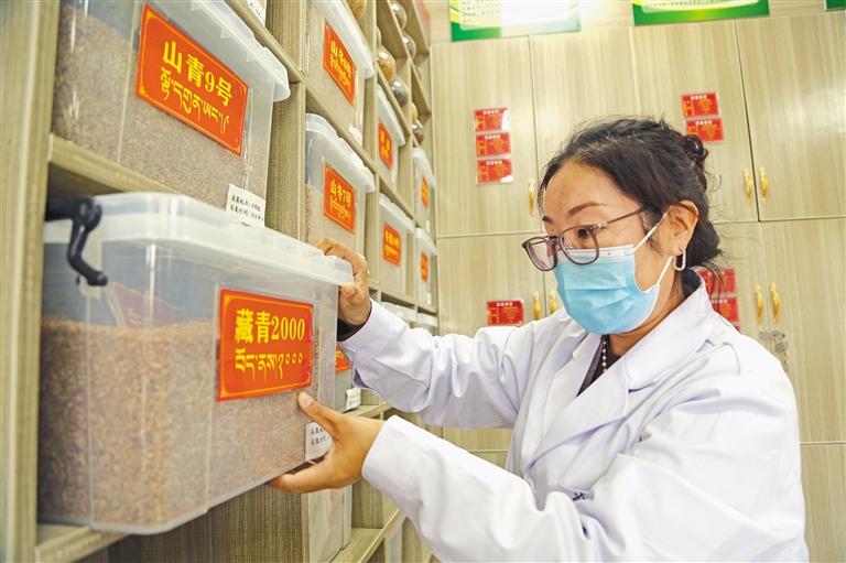 瓊結縣農業農村局高級農藝師尼瑪卓嘎在查驗藏青2000種子。記者 次旺 通訊員 倫珠澤仁 攝