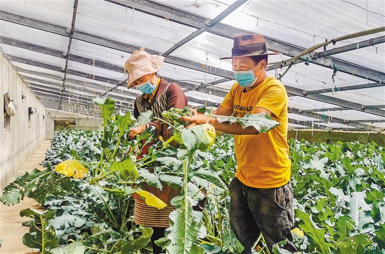 在山南市隆子縣菜籃子基地的大棚內,記者看到,農民們正忙碌地采摘成熟的花椰菜、青椒、西藍花等蔬菜。