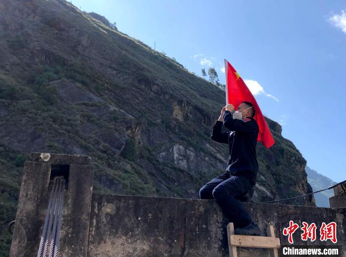 巡邏間隙,移民管理警察攻國杰在口岸遺址上方更換國旗。 郭章統 攝