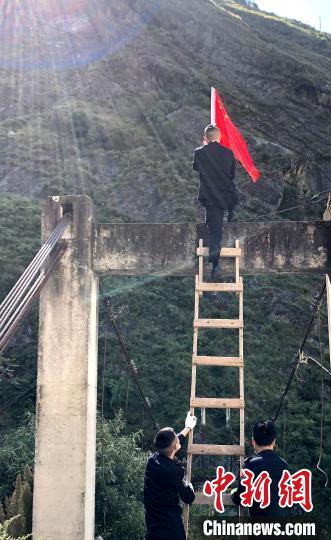 巡邏間隙,移民管理警察在口岸遺址上方更換國旗。 郭章統 攝