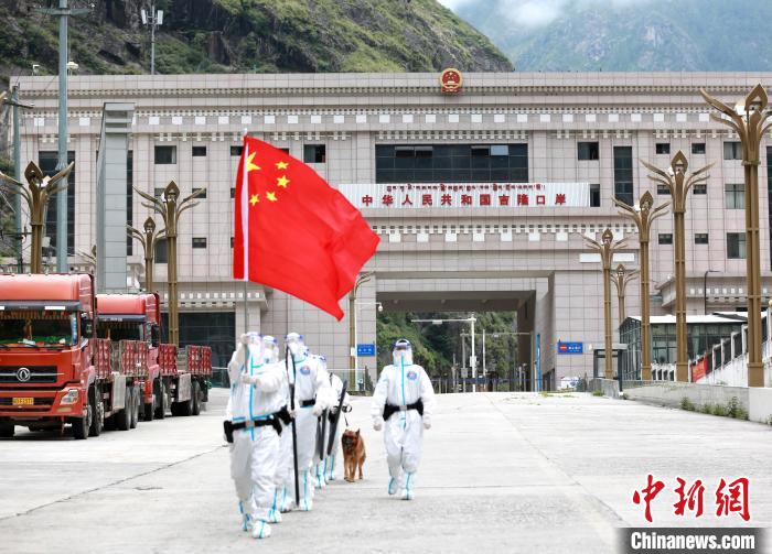 10月1日,駐扎在中尼邊境的吉隆出入境邊防檢查站組織移民管理警察高舉國旗在邊境執勤巡邏任務。
