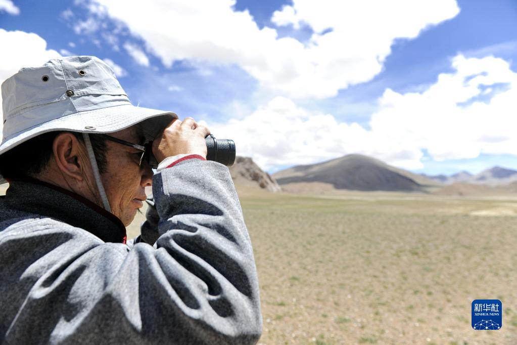 在羌塘國家級自然保護區,野保員用望遠鏡觀察野生動物(2018年8月4日攝)。新華社記者 張汝鋒 攝