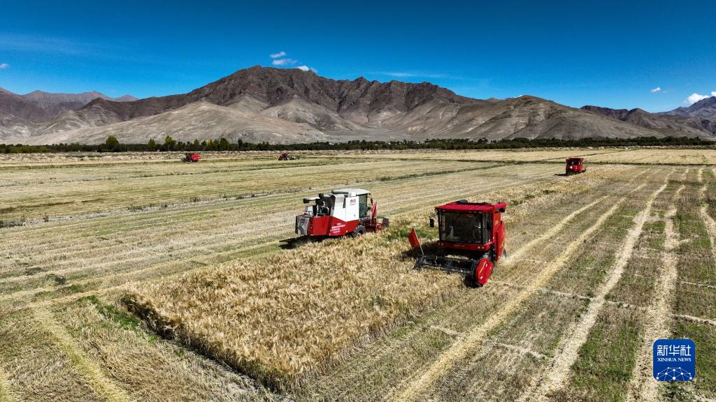 日喀則市江孜縣努康村村民在進行機械化收割。新華社記者 晉美多吉攝