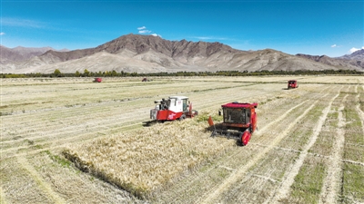 西藏日喀則市江孜縣熱索鄉努康村農機合作社的村民集中對村里三千多畝耕地進行機械化收割新華社記者 晉美多吉攝