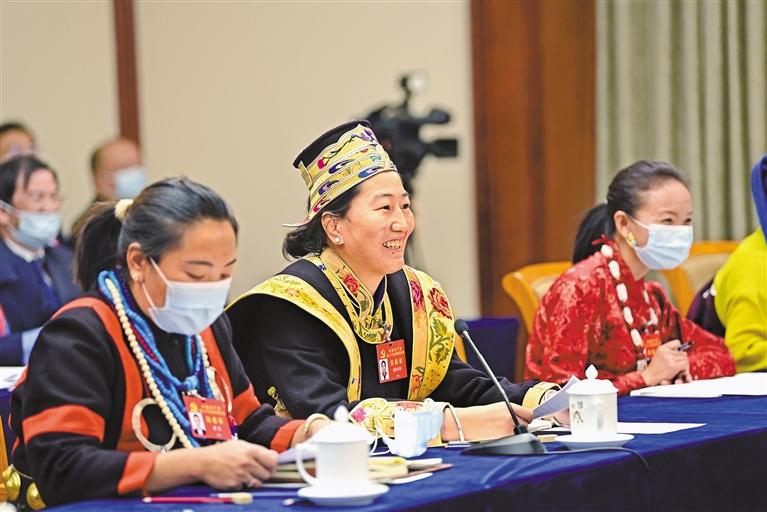 10月17日,西藏代表團舉行分組會議,認真討論黨的二十大報告。 圖為西洛卓瑪代表(中)在會上發言。 旦增西旦 攝