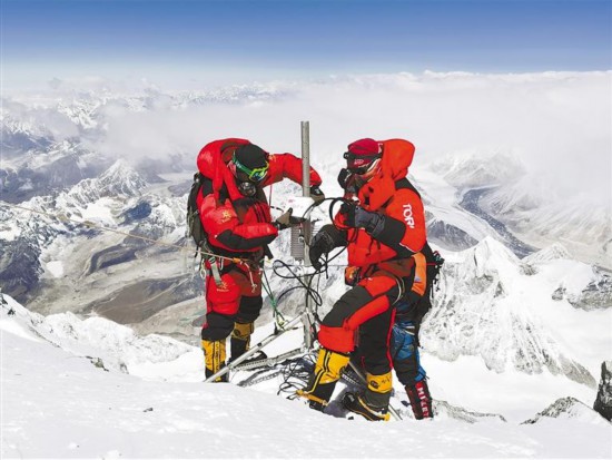配合開展國家第二次青藏高原綜合科學考察研究,助推西藏自治區(qū)加快建設生態(tài)文明高地。圖為2022年5月4日,珠峰科考登頂隊員在珠穆朗瑪峰海拔8830米處成功架設全球海拔最高的自動氣象站。