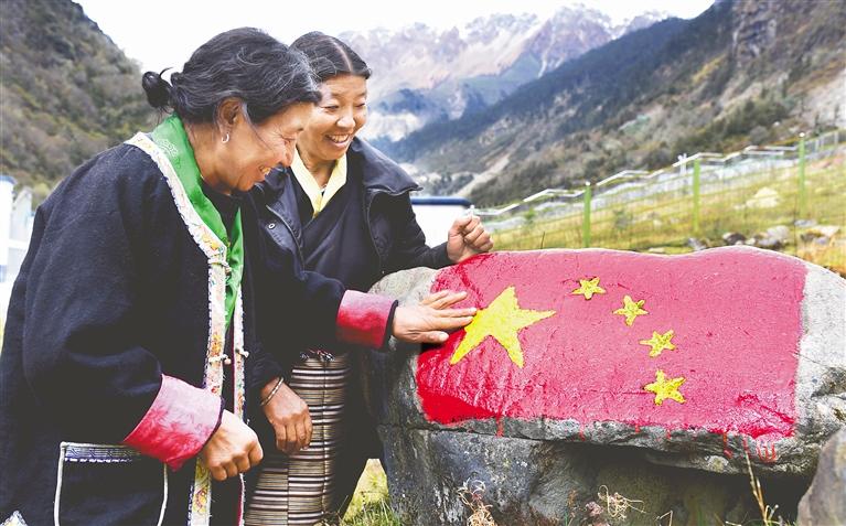 圖為“家是玉麥,國是中國”,人人爭做神圣國土守護者、幸福家園建設者。圖為“七一勛章”獲得者卓嘎和同為“時代楷模”的妹妹央宗抵邊巡邏。