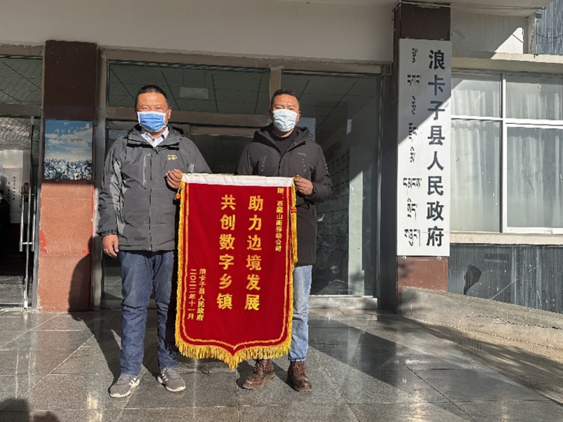 浪卡子縣政府向中國移動山南分公司授予“助力邊境發展 共創數字鄉鎮”錦旗。