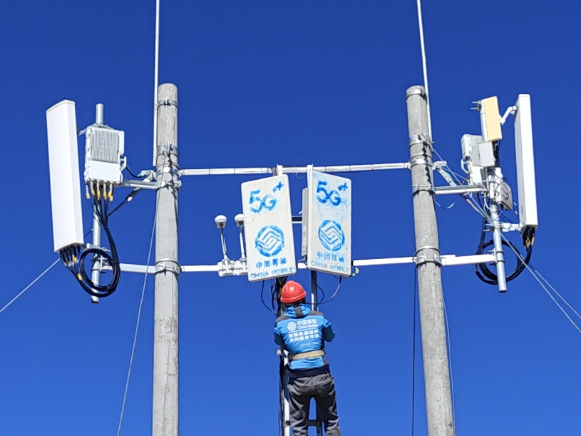 中國移動西藏公司對全國海拔最高鄉浪卡子縣普瑪江塘鄉5G基站進行調測。