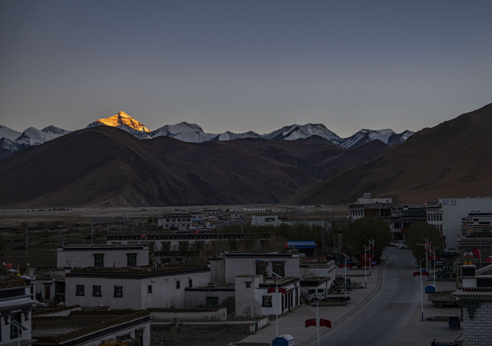 這是扎西宗鄉一角,遠處金色山峰為珠穆朗瑪峰(5月10日攝)。新華社記者 孫非 攝
