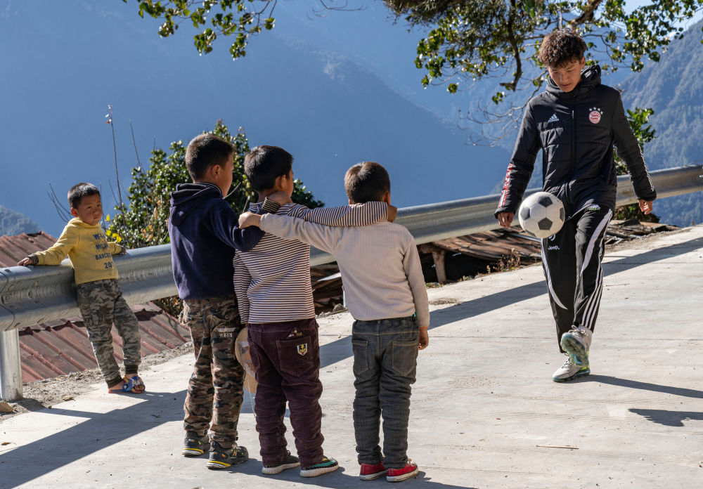 在西藏林芝市墨脫縣德興鄉巴登則村,旺前羅布向弟弟們展示自己的球技(2021年2月9日攝)。新華社記者 孫非 攝