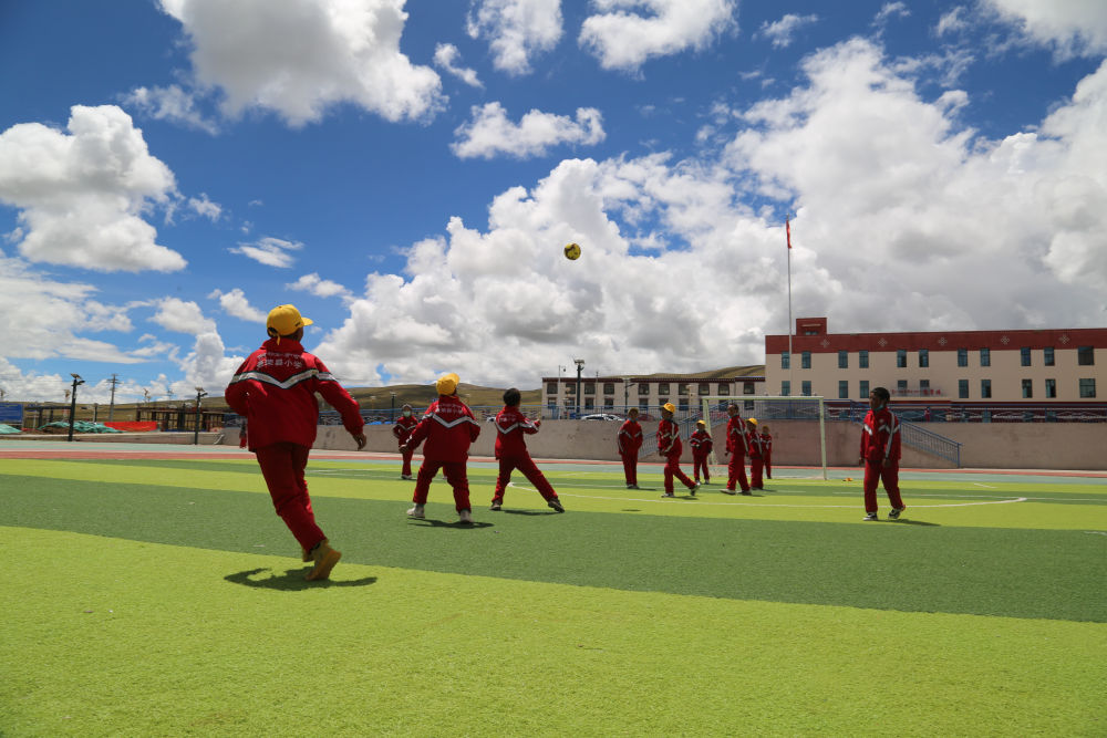 西藏那曲市聶榮縣小學的學生們在踢足球(4月20日攝)。新華社發(大巴次 攝)