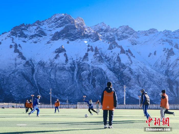 圖為11月25日,西藏那曲市嘉黎縣中學學生們在“雪山下的夢幻足球場”上進行足球訓練。中新社記者 貢嘎來松 攝