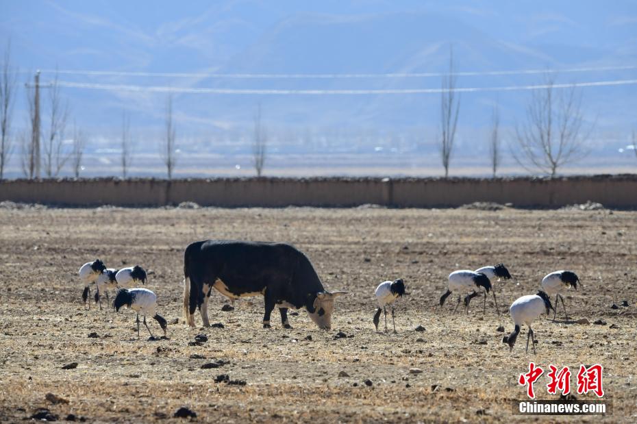 每年的10月底,成群的黑頸鶴飛到西藏拉薩市林周縣越冬,在拉薩市林周縣周邊的湖泊濕地度過5個月的“閑云野鶴”生活,次年三四月份再飛向藏北草原繁殖。黑頸鶴是世界上唯一一種高原鶴類。具有足長、喙長、頸長的典型涉禽類特征,適合在沼澤地里行走。黑頸鶴的頸、尾為黑色,體羽為灰白色。黑頸鶴是國家一級保護動物。目前,每年到林周縣越冬的黑頸鶴已達2000只左右。圖為黑頸鶴在林周境內的農田里覓食。 貢嘎來松 攝