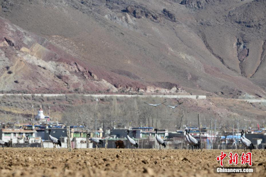 每年的10月底,成群的黑頸鶴飛到西藏拉薩市林周縣越冬,在拉薩市林周縣周邊的湖泊濕地度過5個月的“閑云野鶴”生活,次年三四月份再飛向藏北草原繁殖。黑頸鶴是世界上唯一一種高原鶴類。具有足長、喙長、頸長的典型涉禽類特征,適合在沼澤地里行走。黑頸鶴的頸、尾為黑色,體羽為灰白色。黑頸鶴是國家一級保護動物。目前,每年到林周縣越冬的黑頸鶴已達2000只左右。圖為黑頸鶴在林周境內的農田里覓食。 貢嘎來松 攝