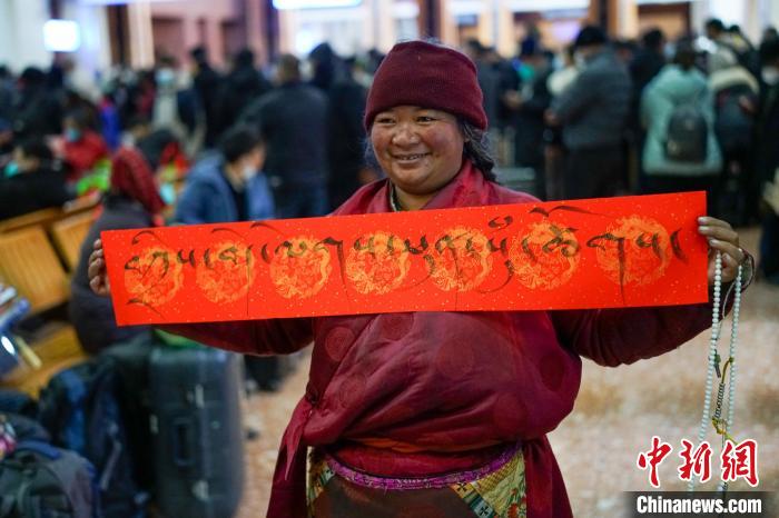 圖為春運首日,拉薩火車站一旅客獲得車站送的藏式春聯,上面書寫的是藏語“扎西德勒 吉祥如意”。 江飛波 攝