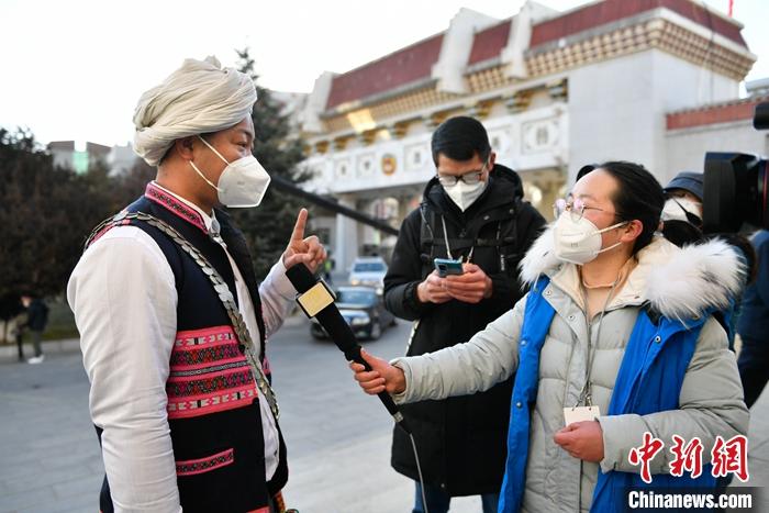 1月12日,政協第十二屆西藏自治區委員會第一次會議在拉薩開幕,西藏政協文化藝術節界委員迪龍(左)接受媒體的采訪。 中新社記者 貢嘎來松 攝
