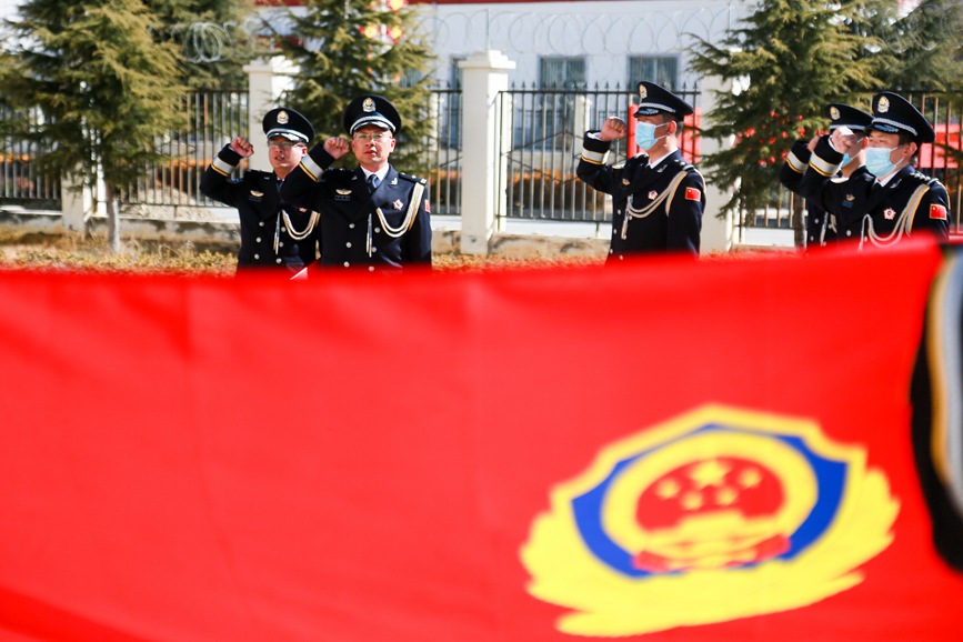 1月9日上午,拉薩鐵路公安處組織迎警旗宣誓儀式,各單位干部民警身著警禮服整齊列隊、莊嚴肅立,在雄壯激昂的警歌聲中向警旗莊重敬禮。升旗儀式結束后,全體干部民警面向警旗,舉起右臂,齊聲宣誓中國人民警察誓詞,夯實獻身于拉鐵公安事業的堅定決心。