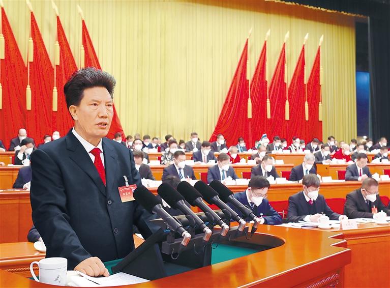 1月14日上午,自治區第十二屆人民代表大會第一次會議舉行第二次全體會議。洛桑江村向大會作自治區人大常委會工作報告。 記者 唐斌 攝