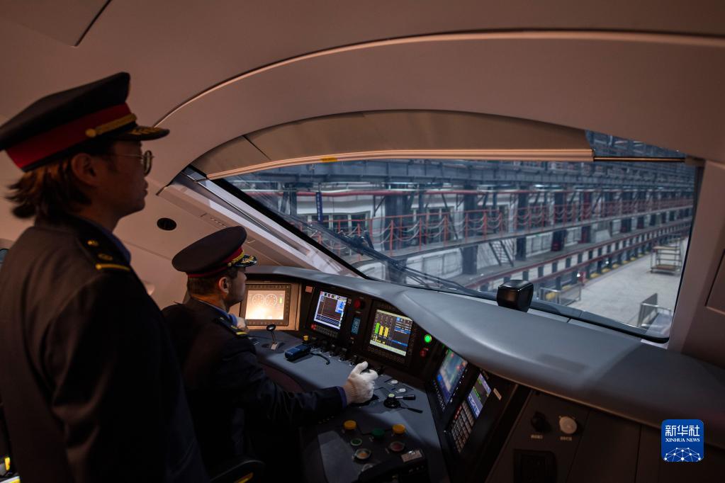 在拉薩機(jī)輛整備中心,黃起崗將動(dòng)車(chē)組駛?cè)胪\?chē)位置(1月11日攝)。新華社記者 孫非 攝