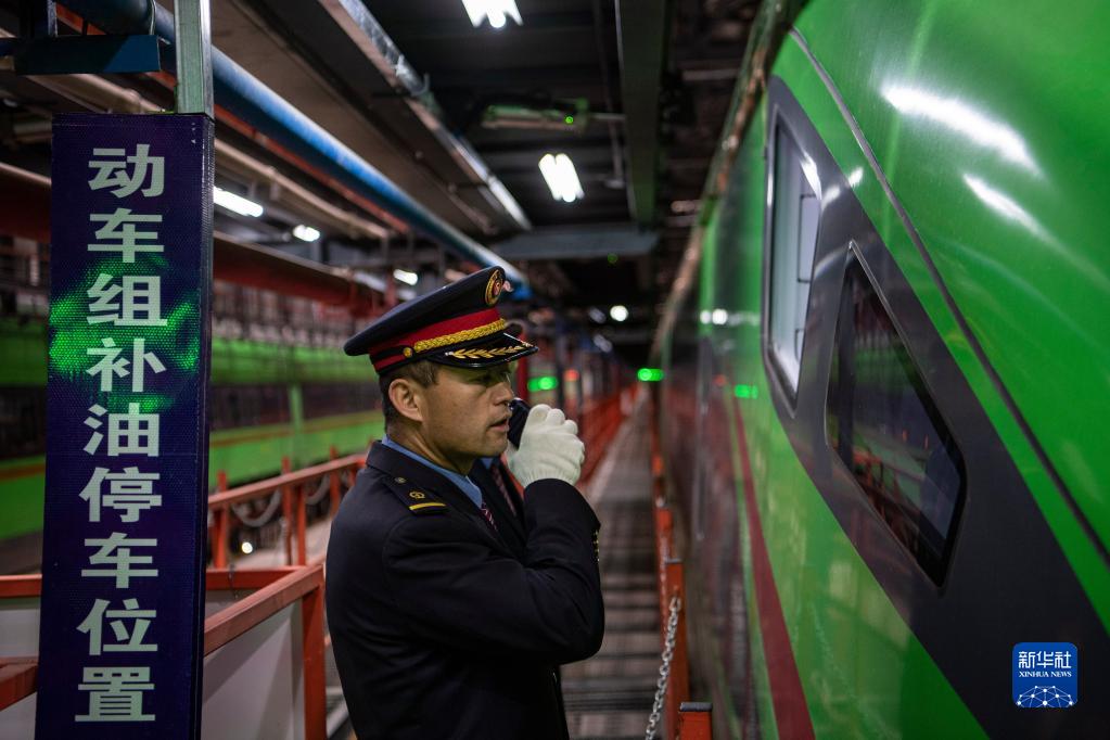 在拉薩機(jī)輛整備中心,黃起崗在和一體化調(diào)度中心確認(rèn)動(dòng)車(chē)組補(bǔ)油位置(1月11日攝)。新華社記者 孫非 攝