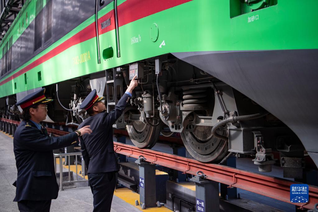 在拉薩機(jī)輛整備中心,黃起崗(右)和同事對(duì)動(dòng)車(chē)組進(jìn)行走行部檢查(1月11日攝)。新華社記者 孫非 攝