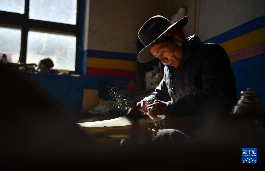 索朗瓊拉的大兒子在制作扎念琴(1月19日攝)。新華社記者 晉美多吉 攝