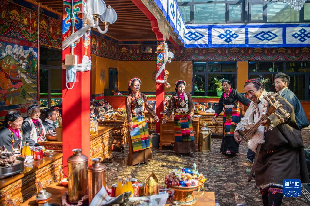 在藏歷農(nóng)家年的家庭聚會中,人們彈奏扎念琴(1月23日攝)。新華社記者 孫非 攝